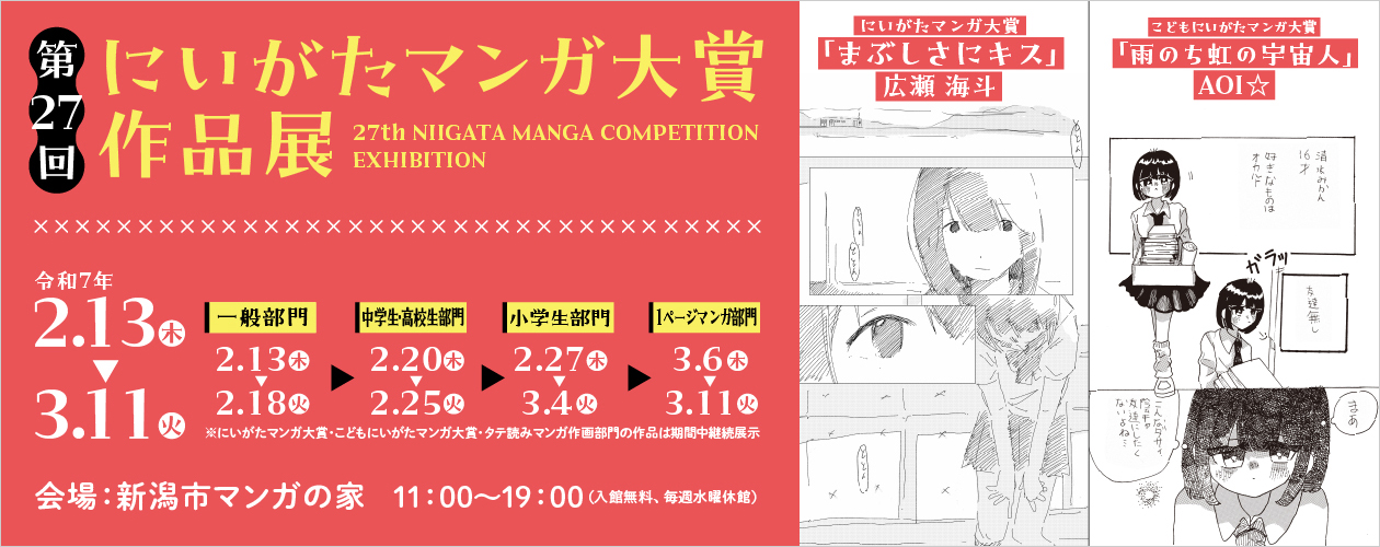 第27回にいがたマンガ大賞の準入選以上の受賞作品を、「新潟市マンガの家」にて1週間ごとに部門を入れ替えながら展示します。